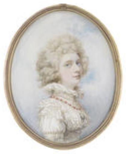 Keywords: ArabellaWilliams WifeOf SirJohnHamlyn1stBaronet.png en Miniature portrait of Arabella Williams 1740-1797 wife of Sir James Hamlyn 1st Baronet 1735-1811 of Edwinsford Carmarthenshire Wales and Clovelly Court in Devon Member of Parliament for Carmarthen 1793-1802 and Sheriff of Devon 1767-8 School of Richard Cosway RA British 1742-1821 A full-length double portrait on paper by Cosway of the Hamlyns walking arm in arm and wearing Van Dyck costume exists in the Victoria Albert Museum E 11-2002 Gold frame with pierced suspension loop blue glass to the reverse Oval 85mm 3 3/8in high One of pair with matching portrait of her husband Pair sold for £1 375 inc premium at Bonhams Auctioneers Knightsbridge London auction 20767 Fine Portrait Miniatures 30 May 2013 lot 98http //www bonhams com/auctions/20767/lot/98/ http //www bonhams com/auctions/20767/lot/98/ School of Richard Cosway RA British 1742-1821 1780 Richard Cosway Portrait miniatures of women PD-old-100 Images from Bonhams |