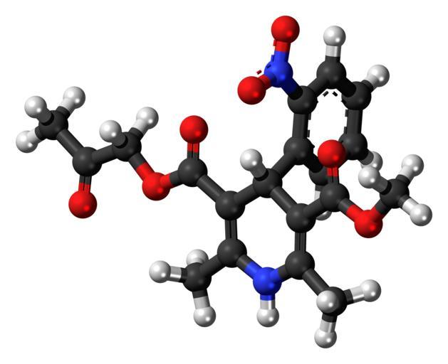 | Keywords: Aranidipine-3D-balls.png Ball-and-stick model of the aranidipine molecule a calcium channel blocker Colour code 505050 Carbon C black<br> F0F0F0 Hydrogen H white<br> F51E1E Oxygen O red<br> 3C50FA Nitrogen N blue<br> 2011-06-13 own DS Visualizer Jynto talk Space-filling version cc-zero Aranidipine Ball-and-stick models Images by Jynto |