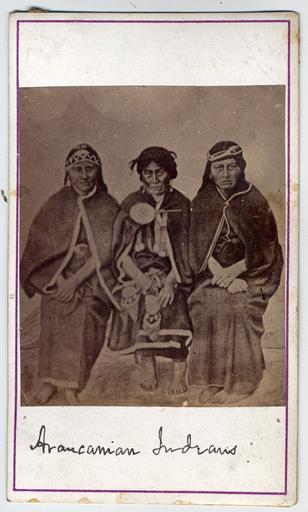 | Keywords: Araucanian Indians.jpg en Photograph black and white ; carte de visite three Mapuche women sitting in a studio; the women on the left wearing trarilonko hair lace/headgear quipan a square cloth wrapped around the body trarihue waistband and ikulla shawl ; elderly woman in centre wearing trarilonko or lloven nitrowe women´s headdress chaway earrings tupu clothes pin pentreor chest hanging of three chains quipan trarihue and ikulla; she is holding two bags; woman on right wearing trarilonko quipan trarihue and ikulla; Pampas Argentina or Chile http //www britishmuseum org/research/search_the_collection_database/search_object_details aspx objectid 3085060 partid 1 searchText mapuche fromADBC ad toADBC ad numpages 10 images on orig 2fresearch 2fsearch_the_collection_database aspx currentPage 3 Christian Enrique Valck 1826 - 1899 Desconocido PD-old-100 Mapuche people |