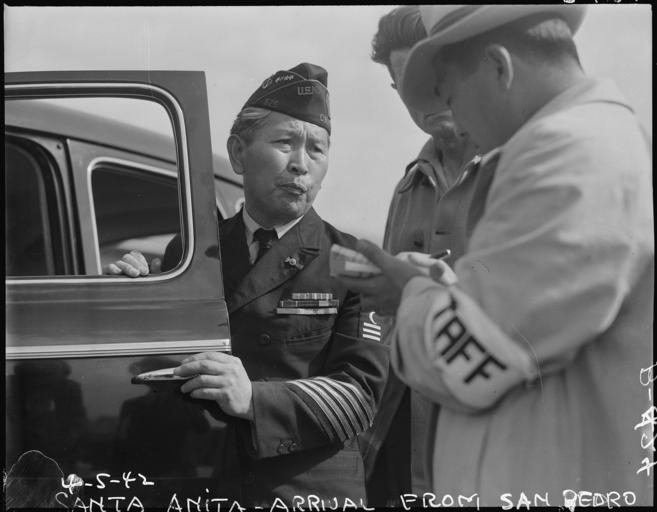 Keywords: Arcadia, California. Dressed in uniform marking service in the first World War, this veteran enters . . . - NARA - 537044.jpg Scope and content The full caption for this photograph reads Arcadia California Dressed in uniform marking service in the first World War this veteran enters Santa Anita assembly center for persons of Japanese ancestry evacuated from the west coast General notes 537044 Local identifier 210-G-B424 Department of the Interior War Relocation Authority 02/16/1944 - 06/30/1946 NARA-Author Albers Clem Photographer 8452194 <br /> Still Picture Records Section Special Media Archives Services Division NWCS-S National Archives at College Park 8601 Adelphi Road College Park MD 20740-6001 1942-04-05 Record group Record Group 210 Records of the War Relocation Authority 1941 - 1989 Record group ARC 537 Central Photographic File of the War Relocation Authority compiled 1942 - 1945 Series ARC 536000 File unit File unit ARC Variant control numbers NAIL Control Number NWDNS-210-G-B424 Other versions <gallery> File Arcadia _California _Dressed_in_uniform_marking_service_in_the_first_World_War _this_veteran_enters_ _ _ _-_NARA_-_537044 tif tif File Arcadia _California _Dressed_in_uniform_marking_service_in_the_first_World_War _this_veteran_enters_ _ _ _-_NARA_-_537044 jpg jpg </gallery> NARA-cooperation PD-USGov Santa Anita Assembly Center