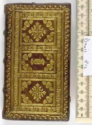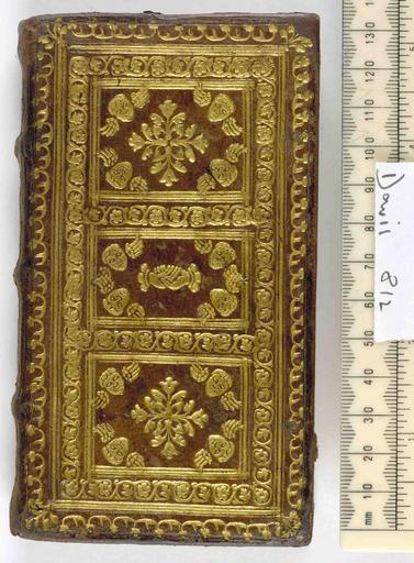 Keywords: Arcadia -and- Le Rime - Upper cover (Davis812).jpg Style Cherubs head Hand motif; Caption Upper cover; Colour Brown; Edge Gilt gauffered exhibition history Decorative Technique Tooled in gold; Cover Material Goatskin includes morocco turkey etc Macchi states; Venetian style c1553 Bought at Librairie ancienne Ulrico Hoepli Milan Bibliothèque Joseph Martini deuxième partie p 82 n 176 object history Text 1553; Venice; Unspecified object type Cc-zero place of creation Binding Italy place of discovery M M Foot The Henry Davis Gift Vol III London 2010 British Library image http //www bl uk/catalogues/bookbindings/LargeImage aspx RecordId 020-000004988 ImageId ImageId 42099 Copyright BL Arcadia and Le Rime Uploaded with GWToolset Arcadia and Le Rime - Upper cover Davis812 http //www webarchive org uk/bldatasets/bindings/6676_4 jpg Gilded books 16th-century bookbinding British Library Bookbindings