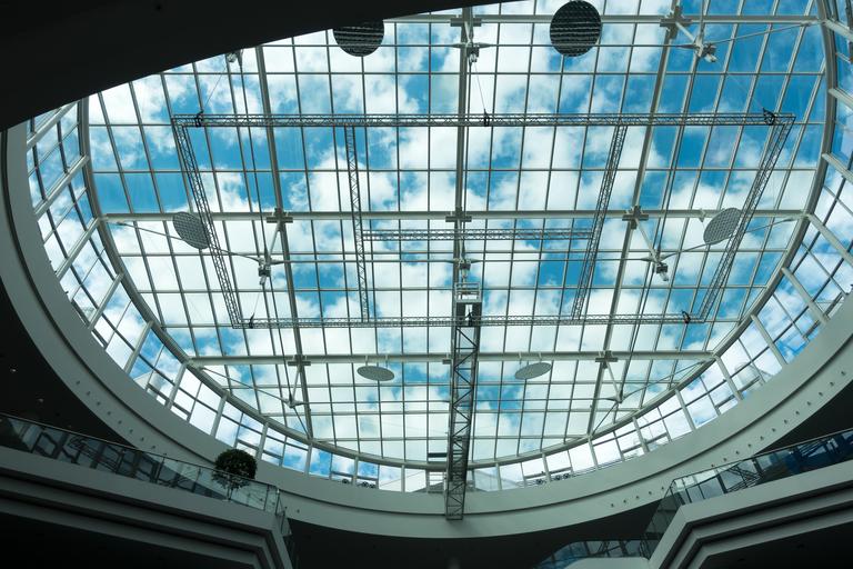 Keywords: architecture building modern glass steel dome dome light sky blue white convention center fair