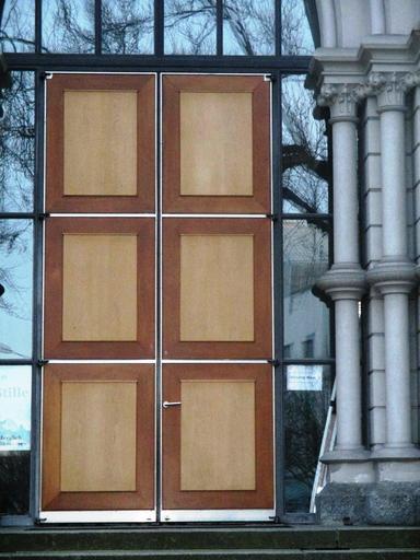 Keywords: architecture input door wood columnar church mirroring reflections amriswil switzerland