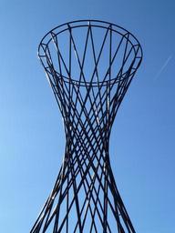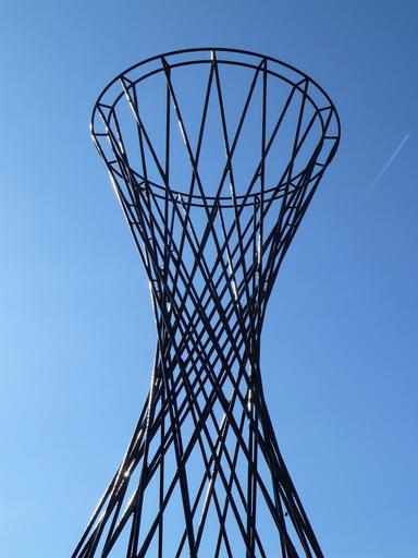 Keywords: architecture monument hyperboloid bars metal steel sun black blue sky munich district tower