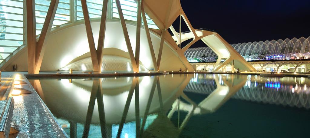 Keywords: architecture santiago calatrava reflection water pond city tourism spain valencia city of the arts valence building light night