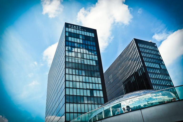 Keywords: architecture skyscraper building city glass facades facade modern structure mirroring glass front düsseldorf clouds sky glazing glass blue low angle shot media harbour hotel