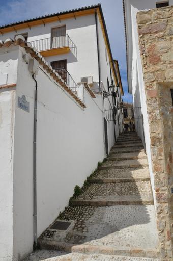 Keywords: architecture street narrow street white buildings stairs building house spain roundabout