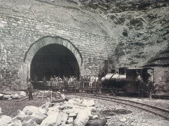 Keywords: Arlbergbahn tunnel construction.jpg Bau des Arlbergtunnels Narrow gauge construction train of the Arlberg railway tunnel in Austria at the Langen entrance 1882 Creator Anton Gratl PD-old Arlbergtunnel Historical images of Vorarlberg Construction in Austria Anton Gratl Tunnelportal Langen |