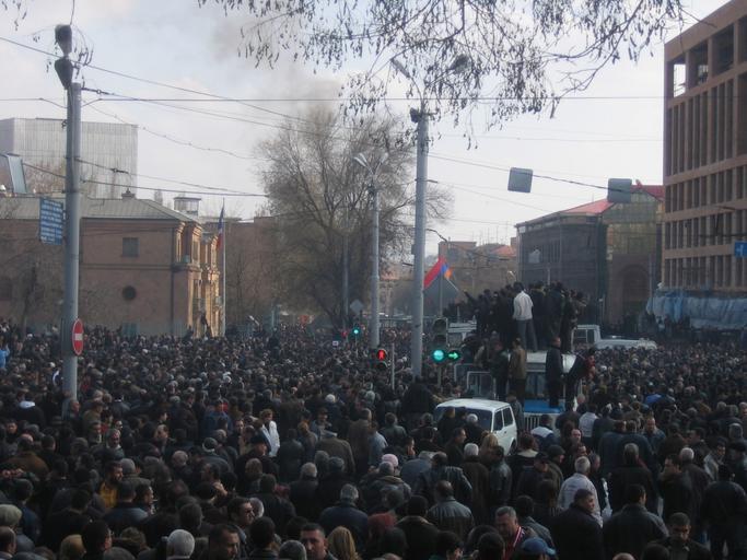 Keywords: Armenian Presidential Elections 2008 Protest Day 11 - French Embassy Demonstration 330pm police car ablaze.jpg The 11th day of Armenian presidential election protests At 7 30 am the peaceful camp-in protest at Liberty Square in Yerevan was violently ended by Armenian special forces which used truncheons and electric shock devices to disperse the crowd of around 1 000 At 12 30 pm a new crowd marches to the French Embassy in a spontaneous demonstration At around 3 20 pm a white unmarked military jeep drove through the crowd at high speed east bound on Argishti St and southbound onto Grigor Lusavorich Ave running over 2 women In this picture 3 30pm the police car has been captured and set ablaze; the policeman escaped on foot Own 2008-03-01 Serouj 40 10 29 93 N 44 30 19 60 E Demonstrations and protests relating to the Armenian presidential elections 2008 |