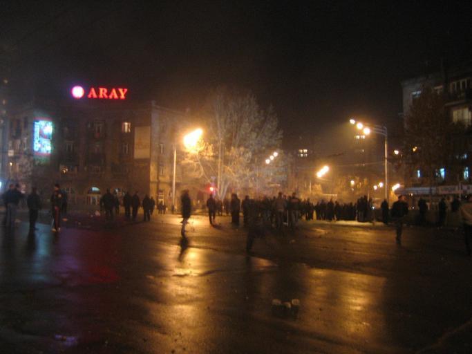 Keywords: Armenian Presidential Elections 2008 Protest Day 11 - 1215AM Mashdots and G. Lusavorich Avenues - pockets of protesters.jpg The 11th day of Armenian presidential election protests At 7 30 am the peaceful camp-in protest at Liberty Square in Yerevan was violently ended by Armenian special forces which used truncheons and electric shock devices to disperse the crowd of around 1 000 At 12 30 pm a new crowd marches to the French Embassy in a spontaneous demonstration barricade themselves using abandoned police buses and grow in number to around 150 000 By 12 am about 2 000 demonstrators are left barricaded <br/><br/>In this picture 12 15 am tens of activists can be seen at the intersection of Mashdots Ave and G Lusavorich Street while the bulk of the 2 000 demonstrators remain a quarter mile southwest on G Lusavorich Street at Miasnikyan Square Some of these tens of people loot a nearby grocery store The opposition claims that they are agent provocateurs sent by the government Meanwhile the nearest police -- positioned 2/3 of a kilometer away at Shahumyan square -- allow anarchy to reign in this area for several hours as government TV crews film tens of people looting the grocery store Own 2008-03-02 Serouj 40 10 37 70 N 44 30 12 08 E Demonstrations and protests relating to the Armenian presidential elections 2008 |