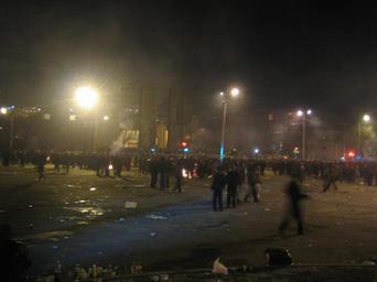 Keywords: Armenian Presidential Elections 2008 Protest Day 11 - 1222AM Miasnikyan Square - bulk of demonstrators.jpg The 11th day of Armenian presidential election protests At 7 30 am the peaceful camp-in protest at Liberty Square in Yerevan was violently ended by Armenian special forces which used truncheons and electric shock devices to disperse the crowd of around 1 000 At 12 30 pm a new crowd marches to the French Embassy in a spontaneous demonstration barricade themselves using abandoned police buses and grow in number to around 150 000 By 12 am about 2 000 demonstrators are left barricaded <br/><br/>In this picture 12 20 am the bulk of the approximately 2 000 demonstrators left in the area are at Miasnikyan Square in front of the French Embassy while only tens of people are at the site of the looting of a grocery store near the intersection of Mashdots Ave and G Lusavorich Street a quarter mile northwest of the location of this camera The nearest police are stationed at Shahuman Square 1/3 of a kilometer northeast of the location of this camera Police allow looting to continue in the area of Mashdots Ave and G Lusavorich for several hours as government TV crews film tens of people looting the grocery store Note Molotov cocktails on the foreground at center left Own 2008-03-02 Serouj 40 10 29 19 N 44 30 18 28 E Demonstrations and protests relating to the Armenian presidential elections 2008 |