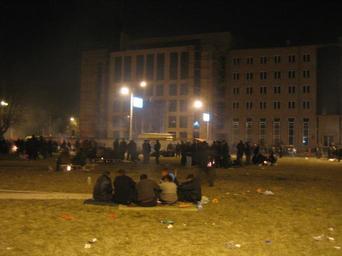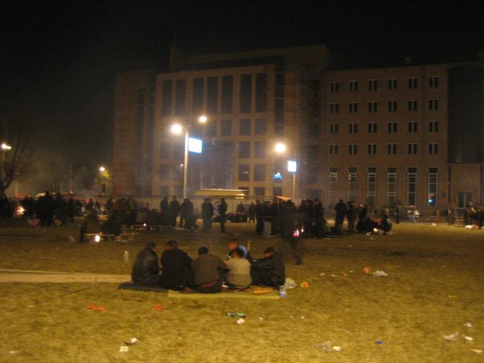Keywords: Armenian Presidential Elections 2008 Protest Day 11 - 1226AM Miasnikyan Square - youth sitting.jpg The 11th day of Armenian presidential election protests At 7 30 am the peaceful camp-in protest at Liberty Square in Yerevan was violently ended by Armenian special forces which used truncheons and electric shock devices to disperse the crowd of around 1 000 At 12 30 pm a new crowd marches to the French Embassy in a spontaneous demonstration barricade themselves using abandoned police buses and grow in number to around 150 000 By 12 am about 2 000 demonstrators are left barricaded <br/><br/>In this picture 12 26 am the bulk of the approximately 2 000 demonstrators left in the area are at Miasnikyan Square in front of the French Embassy while only tens of people are at the site of the looting of a grocery store near the intersection of Mashdots Ave and G Lusavorich Street a quarter mile northwest of the location of this camera The nearest police are stationed at Shahuman Square 1/3 of a kilometer northeast of the location of this camera Police allow looting to continue in the area of Mashdots Ave and G Lusavorich for several hours as government TV crews film tens of people looting the grocery store View south-east; French embassy in background at left Youth continue sit-in protest armed with metal rods in case riot police attack Own 2008-03-02 Serouj 40 10 28 21 N 44 30 17 68 E Demonstrations and protests relating to the Armenian presidential elections 2008 |