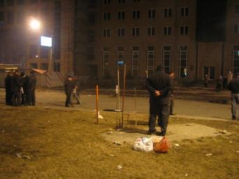 Keywords: Armenian Presidential Elections 2008 Protest Day 11 - 1226AM Miasnikyan Square - braveheart scene - protestor ready for battle.jpg The 11th day of Armenian presidential election protests At 7 30 am the peaceful camp-in protest at Liberty Square in Yerevan was violently ended by Armenian special forces which used truncheons and electric shock devices to disperse the crowd of around 1 000 At 12 30 pm a new crowd marches to the French Embassy in a spontaneous demonstration barricade themselves using abandoned police buses and grow in number to around 150 000 By 12 am about 2 000 demonstrators are left barricaded The bulk of the approximately 2 000 demonstrators left in the area are at Miasnikyan Square in front of the French Embassy while only tens of people are at the site of the looting of a grocery store near the intersection of Mashdots Ave and G Lusavorich Street a quarter mile northwest of the location of this camera The nearest police are stationed at Shahuman Square 1/3 of a kilometer northeast of the location of this camera Police allow looting to continue in the area of Mashdots Ave and G Lusavorich for several hours as government TV crews film tens of people looting the grocery store <br/><br/>In this picture 12 26AM View south-south-east like a scene from a modern-day Braveheart a protester has planted his primitive swords long metal rods into the ground as a modern army of riot police special forces and army prepares for battle less than 1km to the northeast Own 2008-03-02 Serouj 40 10 26 85 N 44 30 17 69 E Demonstrations and protests relating to the Armenian presidential elections 2008 Braveheart |