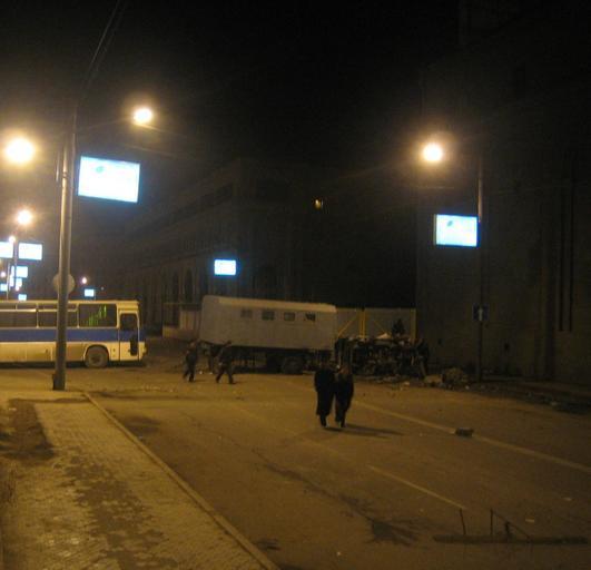 Keywords: Armenian Presidential Elections 2008 Protest Day 11 - 1226AM Miasnikyan Square - western barricade.jpg The 11th day of Armenian presidential election protests At 7 30 am the peaceful camp-in protest at Liberty Square in Yerevan was violently ended by Armenian special forces which used truncheons and electric shock devices to disperse the crowd of around 1 000 At 12 30 pm a new crowd marches to the French Embassy in a spontaneous demonstration barricade themselves using abandoned police buses and grow in number to around 150 000 By 12 am the bulk of the approximately 2 000 demonstrators left in the area are at Miasnikyan Square in front of the French Embassy while only tens of people are at the site of the looting of a grocery store near the intersection of Mashdots Ave and G Lusavorich Street a quarter mile northwest of the location of this camera The nearest police are stationed at Shahuman Square 1/3 of a kilometer northeast of the location of this camera Police allow looting to continue in the area of Mashdots Ave and G Lusavorich for several hours as government TV crews film tens of people looting the grocery store <br/><br/>In this picture 12 32 AM the western barricade Riot police transport bus has been used as a barricade 250 meters west of Miasnikyan Statue This side did not see clashes with police so buses have not been set ablaze nor destroyed on this front Own 2008-03-02 Serouj 40 10 26 47 N 44 30 10 78 E Demonstrations and protests relating to the Armenian presidential elections 2008 |
