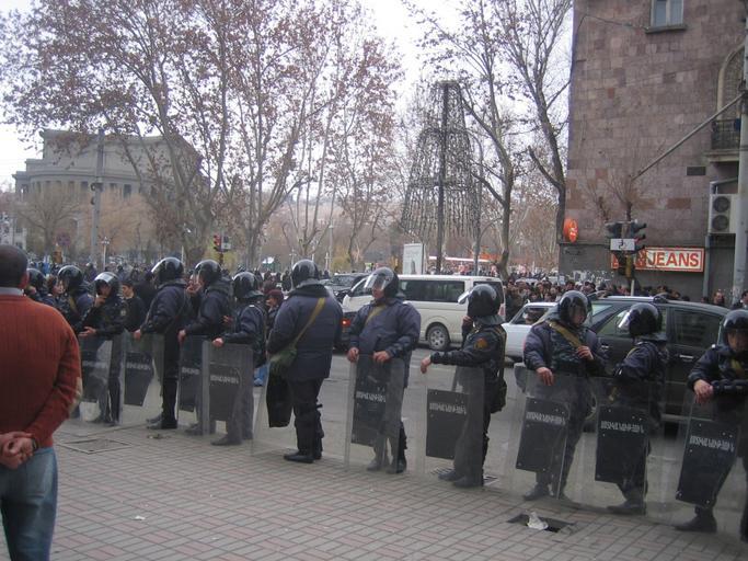 Keywords: Armenian Presidential Elections 2008 Protest Mar 21 - Opera Square ground view.jpg The first day after the 20-day state of emergency had been lifted after the Armenian presidential election protests Between 5pm and 7pm about 1 000 citizens -- mostly women -- participated in a peaceful and silent protest and vigil to remember those who died on March 1 condemn the government's actions and to recognize the more than 100 political prisoners <br/><br/>In this picture 4 44 pm riot police have cordoned off Liberty Square and the sidewalks of adjacent streets all other major squares in Yerevan were likewise cordoned off Note that photography was not allowed Own 2008-03-21 Serouj 40 11 0 57 N 44 30 56 63 E Demonstrations and protests relating to the Armenian presidential elections 2008 |