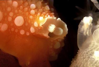 Keywords: Armina maculata Rafinesque, 1814.jpg fr Armina maculata s'apprête à dévorer un polype de Veretillum cynomorium le polype ne pouvant pas se rétracter complètement il sera dévoré par le mollusque obs pers own Parent Géry 2009-11-17 Armina maculata Gastropoda heads Veretillum cynomorium