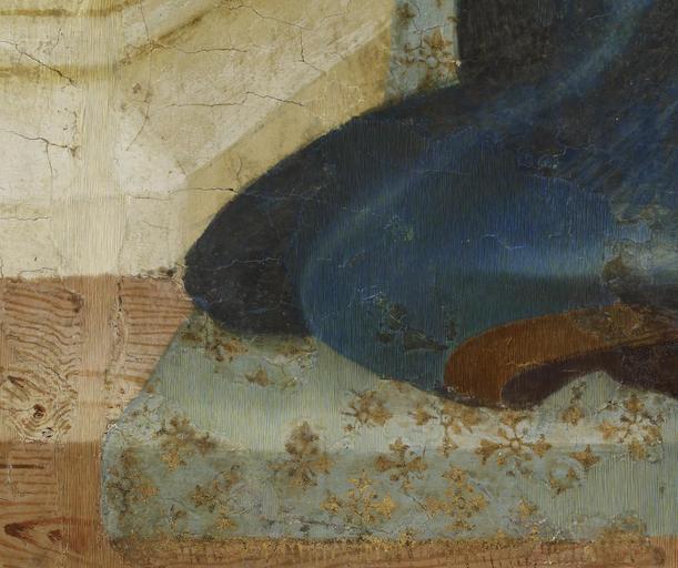 | Keywords: Arnau Bassa - Triptych with Madonna and Child with the Crucifixion and the Annunciation - Walters 37468 - A T Detail O.jpg Circle of The central scene of this altarpiece depicts the enthroned Madonna and Child flanked by angels The Christ Child holds a tiny European goldfinch a symbol of his resurrection The bird is tethered a reminder that in the 14th century such animals were kept as pets by children Angels present Mary with chalices of white flowers alluding to her purity On the left appear the Annunciation and the Crucifixion while Christ's Presentation in the Temple and the Coronation of the Virgin are on the right The delicate punch-work decoration and the slender graceful figures reveal the influence of Sienese painting Catalan artists learned the style and techniques of Italian painting by examining imported Italian works in local churches; some even traveled to Italy to perfect their craft ca 1340 1348 Medieval tempera and gold leaf on panel cm 126 8 184 9 accession number 37 468 1582 Henry Walters Baltimore 1931 mode of acquisition unknown Walters Art Museum Henry Walters Acquired by Henry Walters 1931 The International Style The Arts in Europe Around 1400 The Walters Art Gallery Baltimore 1962 place of origin Catalonia Spain Walters Art Museum license 2D Triptych with Madonna and Child with the Crucifixion and the Annunciation Media contributed by the Walters Art Museum needs category review |