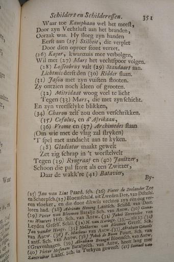 | Keywords: Arnold Houbraken VII p 351.JPG en Copy of Arnold Houbraken's Schouburg from 1719 published and sold by the author nl Waar toe Kampbaan wel het meest Door zyn Vegtlust aan het branden Oorzaak was Hy sloeg zyn handen Eerst aan 25 Stilheid die verplet Door dien oproer stond verzet 26 Kaper kwanzuis meê verbolgen Wil met 27 Mars het vegtspoor volgen 28 Lossenbruy valt 29 Standaart aan Lichtmis derft den 30 Ridder slaan 31 Jason met zyn vuisten stooten Zy ontzien nog kleen of grooten 32 Mitridaat woog veel te licht Tegen 33 Mars die met zyn schicht En zyn vreesselyke blikken 34 Charon zelf zou doen verschrikken 35 Cefalus en d' Afrikaan 36 Vrome en 37 Archimedes staan Om wie met de vlag zal stryken 'T spel met aandagt aan te kyken 38 Gladiator maakt geweld Zet zig schrap in 't worstelveld Tegen 39 Ryngraaf en 40 Janitzer Schoon die pal stond als een Zwitzer Daar de wakk're 41 Batavier 25 Jan van Lint Paerd sch 26 Pieter de Zeelander Zee en Scheepsch 27 Bloemschild uit Zweden Dee van Distelbl een vloeker en die door dikwils vegten zyn een oog verloren had 28 Adriaan Honing Landsch Schild van Dort 29 Pieter van Bloemen Batalje Sch Van Antw 30 Gomarus Wouters Hist Sch van Antw 31 Jakob Torenvliet van Leiden Gezels Schil 32 N van Haringe 33 -zie 27 34 Jan vander Hooge 35 Nolbertus van Bloemen Gezels Sch van Antw 36 F Matheus van Antw 37 Abraham Genoels Lands Sch van Antw 38 Jakob de Baan Pourt Sch van 's Gravenhagen 39 Abraham Breugel Bloemsch van Antw 40 Pieter Hofmans Bataljesch van Antw heeft lang met Zantruiter Lands Sch in Turkyen geweest 41 Samuel van Hoogstraten Hist Sch van Dordr 2015-04-23 17 44 49 own PD-old-100 Jane023 other versions cc-0 Schouburg II Uploaded with UploadWizard Bentvueghels |