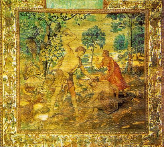 Keywords: Arras Cain Kills Abel.jpg en Cain Kills Abel arras from the collection of Sigismund Augustus modern replica Mid-16th century http //www arrasy-krakow com/index_a php pl 1 Michiel Coxcie Pieter Coecke van Aelst Cornelis Floris Cornelis Bos circle of PD-old-100 Uploaded with UploadWizard Wawel Arrases Cain and Abel |