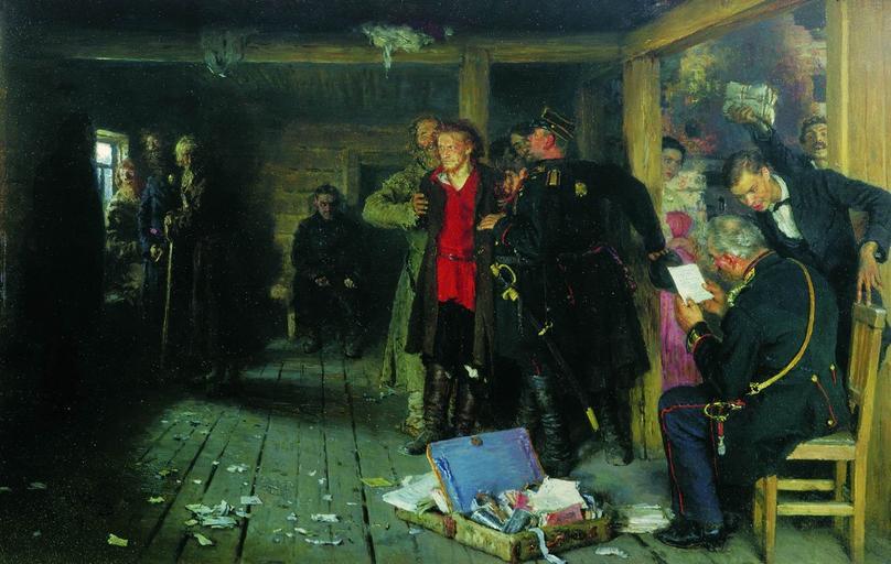 Keywords: Arrest of a Propagandist.jpg Arrest of a Propagandist Oil on panel 34 8 × 54 6 cm The State Tretyakov Gallery Moscow Arresto de un propagandista Óleo sobre tabla 34 8 × 54 6 cm Galería estatal Tretiakov Moscú А ест п опагандиста Де ево масло 34 8 × 54 6 см Госуда ственная Т етьяковская гале ея осква http //www picture art-catalog ru/picture php id_picture 4269 1880-1889 1892 Creator Ilja Jefimowitsch Repin Museum Tretyakov Gallery credit line PD-old-auto 1930 See also <gallery>File Shishakov N I 1968 Arest propagandista stamp 1982 png</gallery> 1892 paintings from Russia Police officers in art Genre paintings by Ilya Yefimovich Repin 19th-century genre paintings in the Tretyakov Gallery Paintings by Ilya Repin in the Tretyakov Gallery Arrests in art 19th-century genre paintings from Russia |