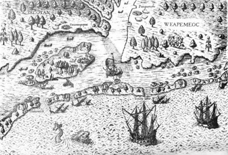 | Keywords: Arrival of Englishmen in North Carolina - 1585.jpg The Arrival of the Englishmen in North Carolina 1585 From Richard Hakluyt The Discourse Concerning Westerne Planting 1585 reprinted in Old South Leaflets Boston The Directors of the Old South Work 1906 http //www wadsworth com/history_d/templates/student_resources/0030724791_ayers/sources/ch01/arrival html appr 1585 Author PD-old-100 Books by Richard Hakluyt British Empire Colonial America Old maps of Virginia Pamlico North Carolina Algonquin Richard Hakluyt |