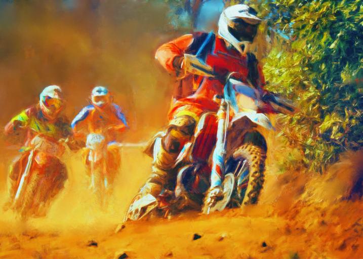 Keywords: art artistic landscape beauty colors creative artwork race bikes mud dust green orange photo painting outside people royalty free