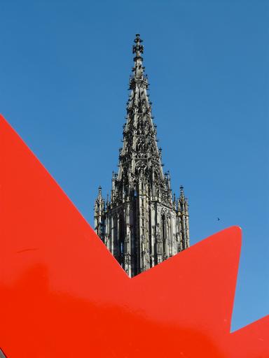 Keywords: art artwork keith haring red dog ulm ulm cathedral münster church steeple building architecture sky blue red