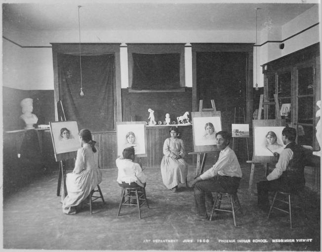 | Keywords: Art Class, Phoenix Indian School, Arizona, 06-1900 - NARA - 518923.jpg Phoenix Indian School Arizona Scope and content General notes 518923 Local identifier 75-EXP-1D Department of the Interior Office of Indian Affairs 1849 - 09/17/1947 Still Picture Records Section Special Media Archives Services Division NWCS-S National Archives at College Park 8601 Adelphi Road College Park MD 20740-6001 06/1900 Record group Record Group 75 Records of the Bureau of Indian Affairs 1793 - 1999 Record group ARC 404 Exhibit Prints Related to Various Jurisdictions Tribes Indian Schools and Activities compiled 1904 - 1936 Series ARC 518922 File unit File unit ARC Variant control numbers Other versions <gallery> File Art_Class _Phoenix_Indian_School _Arizona _06-1900_-_NARA_-_518923 tif tif File Art_Class _Phoenix_Indian_School _Arizona _06-1900_-_NARA_-_518923 jpg jpg </gallery> NARA-cooperation PD-USGov Phoenix Indian School Native American drawing Art of Arizona Classrooms in the United States 1900 1900 in Arizona NARA images of Arizona Black and white photographs of Arizona 1900 Black and white photographs of students 1900 |