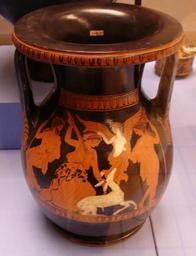 Keywords: Artemis BM E432.jpg Attributed to the Herakles Painter Artemis hunting a stag surrounded by Zeus left Nikê top and Apollo right The goddess is wielding a torch like a spear the torch refering to her role as the bringer of light Attic red-figured pelike From S Agata dei Goti Campania South Italy Artémis chassant un cerf entourée de Zeus gauche Niké la Victoire couronnant la scène et Apollon droite La déesse se sert d'une torche pour lance la torche rappelant son rôle de porteuse de lumière Péliké attique à figures rouges Trouvé à S Agata dei Goti Campanie Italie du Sud between 370 350 BC terracotta Museum British Museum Main floor room 20 Greek Rome object history credit line Blacas Collection accession number GR 1867 5-8 1340 Cat Vases E 432 Bibi Saint-Pol 2006 11 22 other versions Apollo in ancient Greek pottery Artemis in ancient Greek pottery Zeus in ancient Greek pottery Hunting in art Pelikai Herakles Painter Ancient Greek pottery in the British Museum Room 20 British Museum Blacas Collection 370s BC pottery 360s BC pottery 350s BC pottery blurry Nike in ancient Greek pottery Ancient Greek pottery from Saticula Deer hunting Animals in ancient Greek pottery
