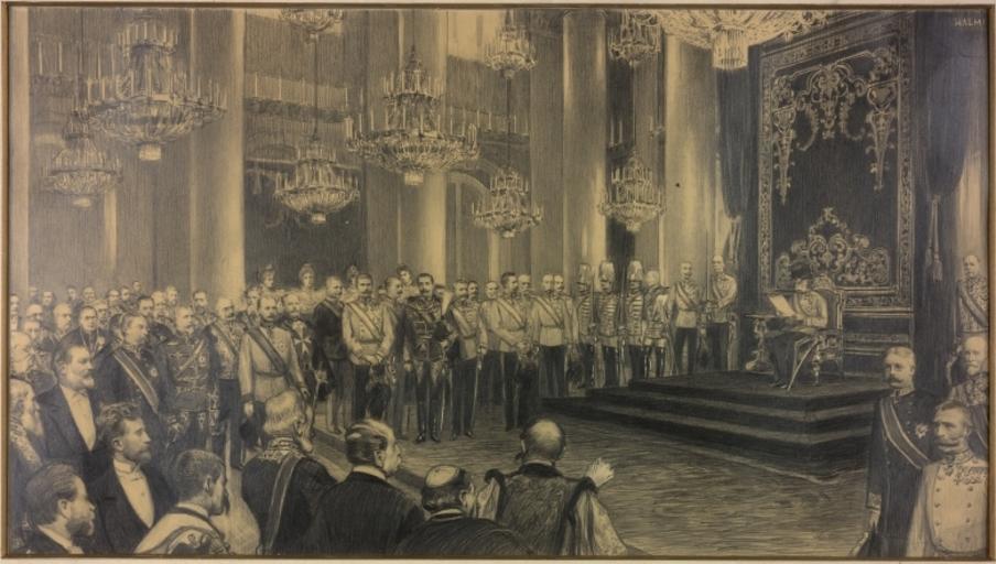 | Keywords: Artúr Lajos Halmi 001.jpg de Kaiser Franz Joseph I verliest im Zeremoniensaal der Hofburg die Thronrede anlässlich der Eröffnung der XII Session des Reichsrates am 29 3 1897 Bleistiftzeichnung auf Papier von Arthur Lajos Halmi signiert In Passpartout montiert Vorzeichnung zu Max Herzig Hg Viribus unitis Das Buch vom Kaiser Budapest Wien Leipzig Verlag Max Herzig 1898 S 30-31 dort genauer Personenschlüssel 1897 http //www bildarchivaustria at/Pages/ImageDetail aspx p_iBildID 16786568 Artúr Lajos Halmi other versions PD-old-70-1923 Artúr Halmi Austrian National Library - Collections Franz Joseph I of Austria Imperial Council Austria Speeches from the Throne Zeremoniensaal Hofburg |