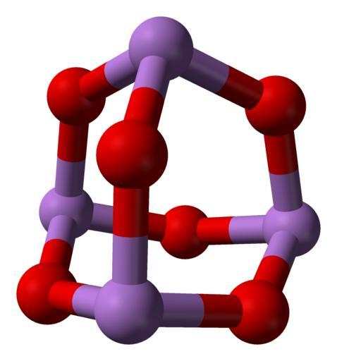 | Keywords: As4O6-molecule-from-arsenolite-xtal-3D-balls.png Ball-and-stick model of the As<sub>4</sub>O<sub>6</sub> molecule as found in the crystal structure of arsenolite the low-temperature cubic form of arsenic trioxide As<sub>2</sub>O<sub>3</sub> X-ray crystallographic data from cite journal Z Krist 217 2002 177-178 http //rruff geo arizona edu/doclib/zk/vol217/ZK217_177 pdf Refinement of the crystal structure of arsenolite As<sub>2</sub>O<sub>3</sub> P Ballirano A Maras Model constructed in http //www crystalmaker com/ CrystalMaker 8 1 Image generated in http //accelrys com/products/discovery-studio/visualization/discovery-studio-visualizer html Accelrys DS Visualizer Own 2009-01-11 Ben Mills Benjah-bmm27 Images by Ben Mills Ball-and-stick models Arsenolite |