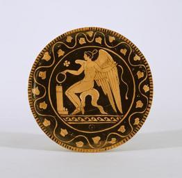Keywords: Ascoli Satriano Painter - Red-Figure Plate with Eros - Walters 482765.jpg Female heads and Eros figures are common features on the vases attributed to the Ascoli Satriano Painter His real name is unknown and he has been named after a northern Apulian town where many of his vases have been found Eros is depicted as a winged youth about to place a wreath as an offering on the cippus pillar in front of him ca 340 320 BC Hellenistic terracotta cm 5 08 24 45 h x diam accession number 48 2765 22720 Münzen und Medaillen A G Basel Switzerland 1983 Marilyn and Herbert Scher Pikesville Maryland 1983 by purchase Walters Art Museum Gift of Marilyn and Herbert Scher 2003 Things With Wings Mythological Figures in Ancient Greek Art The Walters Art Museum Baltimore 2005-2006 place of origin Apulia Italy Walters Art Museum license Ancient Greek red-figure pottery in the Walters Art Museum Ascoli Satriano Painter Media contributed by the Walters Art Museum needs category review Eros in ancient Greek pottery |