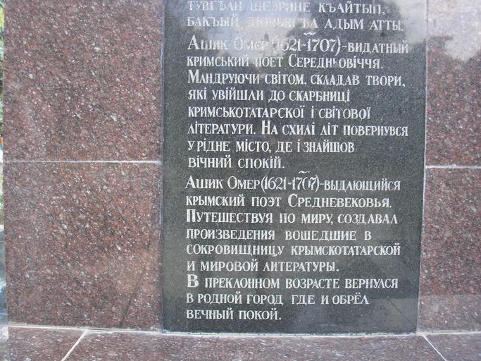 Keywords: Ashik Omer.JPG en Evpatoria Crimea Ashik Omer ru Евпато ия адпись на памятнике Ашик Оме у own Kosun 2009-08-16 Cc-zero Eupatoria