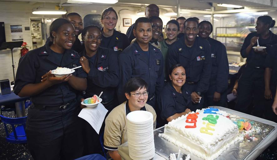| Keywords: Ashland Sailors embrace LGBT Month 150620-N-KM939-072.jpg  en Sailors celebrate Lesbian Gay Bisexual Transgender LGBT month with poetry stories and a cake cutting ceremony in the mess decks on board the USS Ashland LSD-48 Ashland is assigned to the Bonhomme Richard Expeditionary Strike Group and is on patrol in the U S 7th fleet area of operations Photo by Mass Communications 3rd Class Petty Officer David A Cox 2015-06-20 Petty Officer 2nd Class David Cox https //www dvidshub net/image/2034411 150620-N-KM939-072 2015-06-28 21 49 USS ASHLAND INDIAN OCEAN 3 PD-USGov-Military-Navy USS Ashland LSD-48 Images from DoD uploaded by Fæ LGBT Free Media Collective |