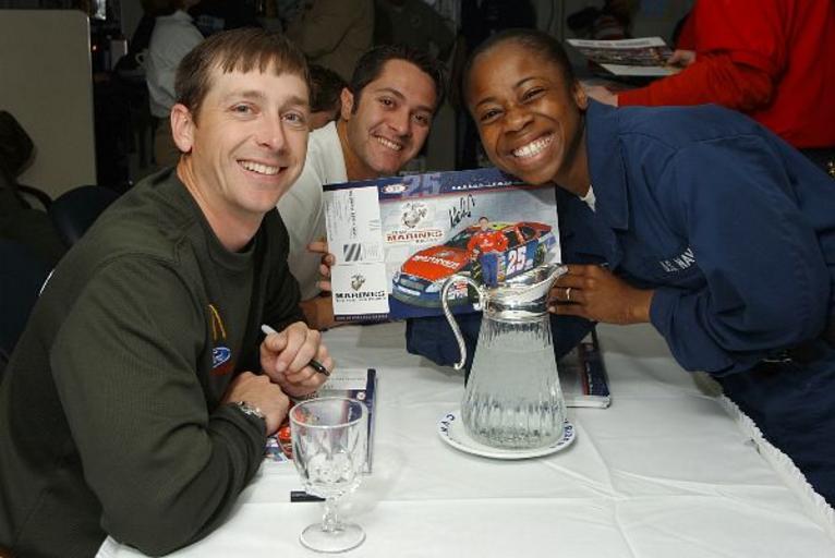 Keywords: Ashton Lewis.jpg 050518-N-6484E-001 Atlantic Ocean May 18 2005 - Aviation Machinist's Mate Airman Jennifer Singleton poses for a photograph with NASCAR Busch Series Drivers Ashton Lewis left of the U S Marines No 25 Ford and David Stremme center of the U S Navy No 14 Dodge during an autograph session aboard the Nimitz-class aircraft carrier USS Theodore Roosevelt CVN 71 The Roosevelt is currently at sea conducting routine carrier operations U S Navy photo by Photographer's Mate Airman Stephen Early RELEASED http //www navy mil/view_image asp id 24480 2005-05-18 U S Navy photo by Photographer's Mate Airman Stephen Early RELEASED 2 All information on this site is public domain and may be distributed or copied unless otherwise specified Use of appropriate byline/photo/image credits is requested http //www navy mil/privacy html PD-USGov NASCAR drivers Ashton Lewis Jr David Stremme |