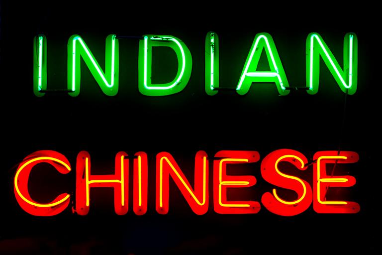 Keywords: asian take away black chinese cuisine dining fast food fluorescent glowing green indian light neon night red restaurant sign text