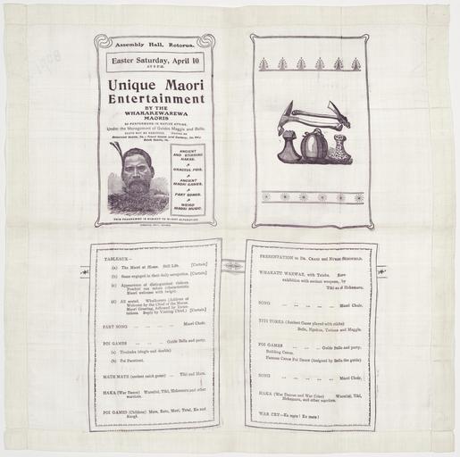 Keywords: text writing drawing sketch Shows four panels, with title panel art top left, Maori gourds and axes at the top right, and the programme of the concert in the lower two panels. Items also included a presentation to Dr Craig and Nurse Schofield. Programme included tableaux of everyday Maori life, a part song, poi games (by Guide Bella and party), Mate Mate (ancient catch game by Tiki and Hara), Haka (by Waretini, Tiki, Hekemaru et al), Poi games by children (Mere, Rato, Muri, Tetai, Ka and Rangi), Whakatu Waewae, with taiaha (Tiki and Hekemaru), Song, Titi Torea (stick game - with Bella, Ngahua, Tatiana and Maggie), Poi games (Bella et al), Song, Haka (Waretini, Tiki, Hekemaru, et al). Quantity: 1 colour photo-mechanical print(s). Physical Description: Letterpress on silk handkerchief, 407 x 407 mm. Provenance: From the collection of Kenneth Webster. Rotorua chronicle (Newspaper). Assembly Hall, Rotorua :Easter Saturday, April 10. Unique Maori Entertainment by the Whakarewarewa Maoris, 50 performers in native attire, under the management of Guides Maggie and Bella. Ancient and stirring hakas, graceful pois, ancient Maori games, parts songs, weird Maori music. Chronicle Print, Rotorua . [Silk handkerchief. 1908].. Ref: Eph-D-MAORI-CONCERTS-1908-01. Alexander Turnbull Library, Wellington, New Zealand. natlib.govt.nz/records/23044424 Shows four panels, with title panel art top left, Maori gourds and axes at the top right, and the programme of the concert in the lower two panels. Items also included a presentation to Dr Craig and Nurse Schofield. Programme included tableaux of everyday Maori life, a part song, poi games (by Guide Bella and party), Mate Mate (ancient catch game by Tiki and Hara), Haka (by Waretini, Tiki, Hekemaru et al), Poi games by children (Mere, Rato, Muri, Tetai, Ka and Rangi), Whakatu Waewae, with taiaha (Tiki and Hekemaru), Song, Titi Torea (stick game - with Bella, Ngahua, Tatiana and Maggie), Poi games (Bella et al), Song, Haka (Waretini, Tiki, Hekemaru, et al). Quantity: 1 colour photo-mechanical print(s). Physical Description: Letterpress on silk handkerchief, 407 x 407 mm. Provenance: From the collection of Kenneth Webster. Rotorua chronicle (Newspaper). Assembly Hall, Rotorua :Easter Saturday, April 10. Unique Maori Entertainment by the Whakarewarewa Maoris, 50 performers in native attire, under the management of Guides Maggie and Bella. Ancient and stirring hakas, graceful pois, ancient Maori games, parts songs, weird Maori music. Chronicle Print, Rotorua . [Silk handkerchief. 1908].. Ref: Eph-D-MAORI-CONCERTS-1908-01. Alexander Turnbull Library, Wellington, New Zealand. natlib.govt.nz/records/23044424 |