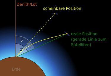 MAKE A MEME View Large Image Astrorefraction-satellites-de.svg en Light from satellites is being refracted although in a continuous fashion by the increasing density of the earth's atmosphere However the effect isn't as dramatic as in the case of stars because the true ...