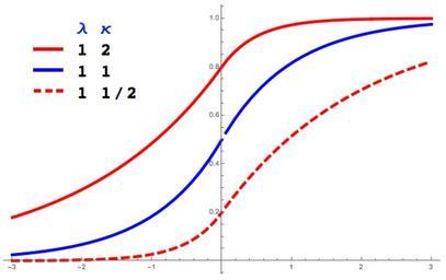 | Keywords: AsymmetricLaplaceCDF.jpg en Some examples of the cumulative distribution function for the asymmetric Laplace distribution with mean zero and scaling parameter λ 1 Blue corresponds to asymmetry parameter κ 1 the solid red κ 2 and the dashed red κ 1/2 own PAR 2016-01-04 Statistical charts Cc-zero |