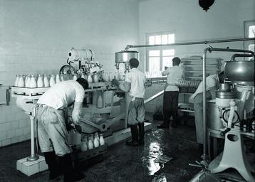 Keywords: monochrome Wine and Juice Factory and Beer Factory were founded in 1925 and 1933 respectively. Pasteurized Milk Factory, yogurt, butter and cheese plants were opened. Ice Factory was able to produce 4 tonnes of ice daily. The first zoo in Ankara was opened in the Atatürk Forest Farm. In 1933, they began to display some animals on a small garden behind the building of Farm Directorate. Atatürk Orman Çiftliği Pastörize Süt Fabrikası, çalışanlar, 1939 1925’te Şarap ve Meyve Suları Fabrikası, 1933’te Bira Fabrikası kuruldu. Pastörize Süt Fabrikası, yoğurt, tereyağı, peynir imalathaneleri açıldı. Buz Fabrikası’nda günde dört ton buz üretiliyordu. Kent içerisinde Atatürk Orman Çiftliği ürünlerinin Ankara halkına ulaşmasını sağlayan dükkânlar açıldı. Ankara’nın ilklerinden biri, Hayvanat Bahçesi de Atatürk Orman Çiftliği aracılığıyla gerçekleşmiştir. 1933’te Çiftlik Müdürlüğü binasının arkasında küçük bir bahçe içerisinde bazı hayvanların teşhirine başlanmıştı. Wine and Juice Factory and Beer Factory were founded in 1925 and 1933 respectively. Pasteurized Milk Factory, yogurt, butter and cheese plants were opened. Ice Factory was able to produce 4 tonnes of ice daily. The first zoo in Ankara was opened in the Atatürk Forest Farm. In 1933, they began to display some animals on a small garden behind the building of Farm Directorate. Atatürk Orman Çiftliği Pastörize Süt Fabrikası, çalışanlar, 1939 1925’te Şarap ve Meyve Suları Fabrikası, 1933’te Bira Fabrikası kuruldu. Pastörize Süt Fabrikası, yoğurt, tereyağı, peynir imalathaneleri açıldı. Buz Fabrikası’nda günde dört ton buz üretiliyordu. Kent içerisinde Atatürk Orman Çiftliği ürünlerinin Ankara halkına ulaşmasını sağlayan dükkânlar açıldı. Ankara’nın ilklerinden biri, Hayvanat Bahçesi de Atatürk Orman Çiftliği aracılığıyla gerçekleşmiştir. 1933’te Çiftlik Müdürlüğü binasının arkasında küçük bir bahçe içerisinde bazı hayvanların teşhirine başlanmıştı. |