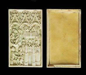 Keywords: Atelier of the Boxes - Writing Tablet and Lid - Walters 71283 - View B.jpg During the Middle Ages paper and parchment were expensive and many people took advantage of less permanent forms of written communication One side of an ivory tablet was coated with wax; then a message was incised in the wax with a stylus which looks like a large pin and protected by an ivory lid The little box would be sent to the recipient who smoothed the wax and responded The sliding cover depicts three ladies in the town looking over its walls at two embracing couples seen to the left The bottom of the box shows the same town at greater distance a tent with two more lovers a hawking expedition and a hermit reading outside his rustic cell Several writing boxes are known from the same otherwise unidentified workshop between 1340 1360 Medieval ivory H 3 11/16 x W 2 1/8 x D of tablet and lid together 7/16 in 9 3 x 5 4 x 1 1 cm accession number 71 283 9704 Sale Cologne December 14 1893 no 92 Marcus Antocolsky Paris date and mode of acquisition unknown Marcus Antocolsky Sale Hotel Drouot Paris June 10 1901 no 73 George Robinson Harding London date and mode of acquisition unknown Henry Walters Baltimore June 15 1901 by purchase Walters Art Museum Henry Walters Acquired by Henry Walters 1901 The International Style The Arts in Europe Around 1400 The Walters Art Gallery Baltimore 1962 Images of Love and Death in Late Medieval and Renaissance Art The University of Michigan Museum of Art Ann Arbor 1975-1976 The Medieval Garden Spencer Museum of Art Lawrence; Dumbarton Oaks Washington 1983 Images in Ivory Precious Objects of the Gothic Age The Detroit Institute of Arts Detroit; The Walters Art Gallery Baltimore 1997 place of origin north France Walters Art Museum license Medieval ivory in the Walters Art Museum Atelier of the Boxes Media contributed by the Walters Art Museum needs category review |