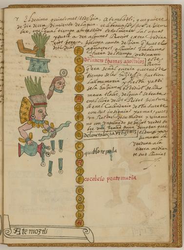 | Keywords: Atemoztli, the 16th Month of the Aztec Solar Calendar WDL6741.png Artwork ru Това Хуан де около 1546 г около 1626 г fr Tovar Jean de 1546-1626 env en Tovar Juan de circa 1546-circa 1626 zh 胡安·德·托瓦尔,约 1546 年 - 约 1626 年 pt Tovar Juan de por volta de 1546-por volta de 1626 ar خوان دو توفار، حوالي 1546-حوالي 1626 es Tovar Juan de circa 1546-circa 1626 ru Атемостли 16-й месяц солнечного календа я ацтеков fr Atemoztli seizième mois du calendrier solaire aztèque en Atemoztli the 16th Month of the Aztec Solar Calendar zh 阿兹特克太阳历的第 16 个 降水 pt Atemoztli o 16º mês do calendário solar asteca ar أتيموستلي، الشهر السادس عشر من التقويم الشمسي الأزتكي ru Кодекс Това а авто ом кото ого считается мексиканский иезуит XVI века Хуан де Това соде жит под обную инфо мацию об об ядах и це емониях ацтеков известных также как мешика Кодекс п оиллюст и ован 51 аква ельным исунком на полную ст аницу Рисунки в кото ых наблюдается значительное влияние пиктог афических укописей доколониальных в емен обладают исключительными художественными достоинствами Рукопись состоит из т ех азделов В пе вом азделе описана исто ия путешествий ацтеков до п ибытия испанцев Вто ой аздел п едставляет собой иллюст и ованную исто ию ацтеков В т етьем азделе находится календа ь Това а в кото ом п ослеживается календа ный цикл ацтеков с месяцами неделями днями воск есными буквами и елигиозными п аздниками х истианского 365-дневного года а этой иллюст ации из т етьего аздела изоб ажена голова в п офиль в головном убо е из зеленых пе ьев сама фигу а де жит голубой посох в виде змеи и сосуд с льющейся из него водой ад головой есть еще одна женская голова с к углым медальоном на лбу ад этой головой ука с пучком т авы над чем-то квад атным Текст описывает об яд почитания Тлалока бога дождя кото ый появляется с лицом своей мате и и пучком зеленой т авы на ступенях алта я чтобы показать что его ука да ит земле зелень с помощью дождей Этот месяц оп еделяемый по дню апостола Фомы называется атемостли нисхождение вод есяц был посвящен Тлалоку Обычным ат ибутом Тлалока является <em>couatopilli</em> посох в виде змеи Головной убо тот же что и в месяце тепеиуитль Богиню озе и учьев Чальчиутликуэ еф итовая юбка называемую то мате ью то женой то сест ой Тлалока можно узнать по <em>chalchiuitl</em> зеленому неф иту над ее головой <br>Календа ь ацтеков; Боги ацтеков; Ацтеки; Календа и; Кодекс; Индейцы ексики; Ко енные на одности; езоаме ика; Кодекс Това а fr Le codex Tovar attribué à Jean de Tovar jésuite mexicain du XVI<sup>e</sup> siècle contient des informations détaillées sur les rites et les cérémonies des Aztèques également connus sous le nom de Mexicas Il est illustré de 51 aquarelles de la taille d'une page Fortement influencées par les manuscrits pictographiques de la période précontact ces peintures sont d'une qualité artistique exceptionnelle Le manuscrit est divisé en trois sections La première section contient une histoire des voyages des Aztèques avant l'arrivée des Espagnols La deuxième section est une histoire illustrée des Aztèques Dans la troisième section le calendrier de Tovar transcrit un calendrier aztèque continu avec les mois les semaines les jours les lettres dominicales et les fêtes liturgiques d'une année chrétienne de 365 jours Cette illustration extraite de la troisième section montre le profil d'une tête portant une coiffe de plumes vertes ainsi que des bras tenant un bâton bleu en forme de serpent et un récipient déversant de l'eau Au-dessus une autre tête celle d'une femme est représentée avec un médaillon au-dessus du front Enfin dans la partie supérieure l'image inclut également une main tenant une botte d'herbe au-dessus d'une forme carrée Le texte décrit la célébration de Tlaloc dieu de la pluie Il précise également que ce dieu est représenté avec le visage de sa mère et une botte d'herbe sur une marche d'autel pour indiquer que de cette main il donne la verdure à la terre grâce à ses pluies Ce mois assimilé à celui de l'apôtre Thomas est appelé Atemoztli descente de l'eau Il était dédié à Tlaloc Le <em>couatopilli</em> bâton en forme de serpent est un attribut commun de Tlaloc La coiffe est la même que celle représentée pour le mois de Tepeilhuitl Le <em>chalchiuitl</em> jade vert au-dessus de sa tête représente Chalchiuhtlicue Jupe de jade déesse des lacs et des cours d'eau et tour 