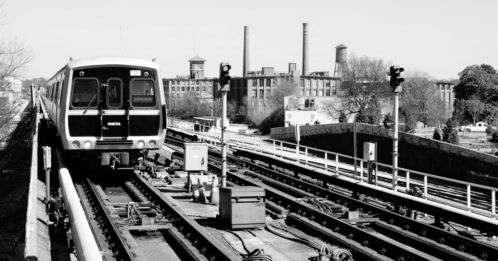 Keywords: blackandwhite monochrome train vehicle outdoor sport black and white A westbound MARTA Green Line approaching the King Memorial Station. A westbound MARTA Green Line approaching the King Memorial Station.