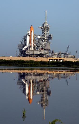 Keywords: atlantis space shuttle launch mission astronauts rollout rockets spacecraft sky orbit exploration spaceship flight blast off water reflection launch pad preparation
