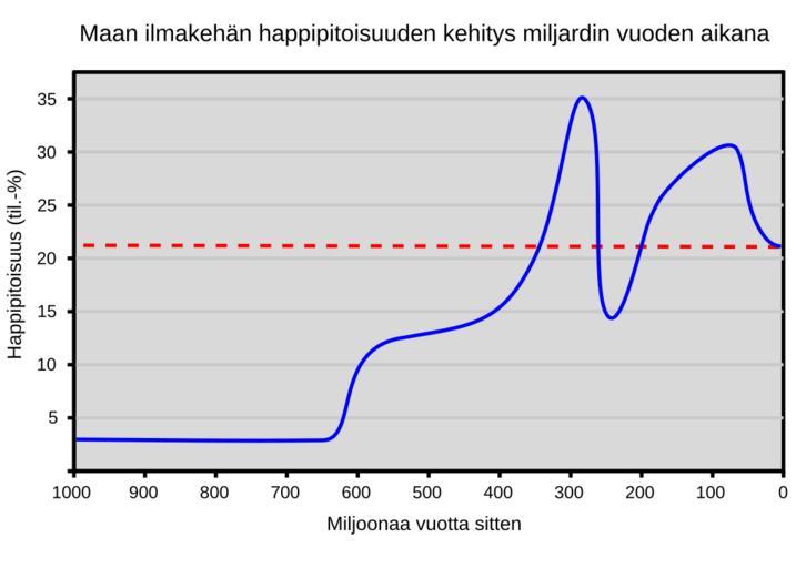 | Keywords: ATM Oxygen Content fi.svg Dieses Diagramm stellt die Sauerstoffkonzentration in der Erdatmosphäre im Lauf der letzten Jahrmilliarde dar Als Referenz zeigt die gestrichelte rote Linie die heutige Konzentration von 21 an Es ist anzumerken dass die Zeiträume in denen vergangene Schwankungen der O2-Konzentration auftraten oft nur relativ grob abgeschätzt werden können Daher erhebt das Diagramm keinen Anspruch auf Exaktheit sondern kann nur einen groben à berblick der Entwicklung auf der Ebene erdgeschichtlicher Perioden geben Dieses Diagramm beruht auf Mittelwerten bzw à bereinstimmungen aus mehreren Publikationen<ref>http //webspace webring com/people/fg/gunnar_ries/ozwei html Gunnar Ries Dicke Luft bei den Sauriern</ref><ref>http //www geoversum de/forum/viewtopic php f 19 t 513 Geologie-Forum Geoversum Massensterben an der Perm-Trias Grenze Durch Sauerstoffmangel erstickt </ref> Erläuterung der Kurve Nachdem bereits im Präkambrium die Ausgasung von Sauerstoff aus den Ozeanen begonnen hatte stieg der Sauerstoffgehalt etwa Anfang des Kambriums sprunghaft von 3 auf 12 an da nun endgültig alle Sauerstoffsenken abgesättigt waren Ungefähr zur gleichen Zeit setzte die Kambrische Explosion ein Während des Silur und Devon eroberten Pflanzen das Land während sich das Tierreich noch immer praktisch ausschließlich auf das Wasser beschränkte Dies löste einen weiteren schnellen und kontinuierlichen Anstieg der Sauerstoffkonzentration aus Im darauffolgenden Karbon hatte diese 35 erreicht<ref>http //www wissenschaft de/wissenschaft/hintergrund/214519 html wissenschaft de Gigantismus Fliegen und Antiaging Sauerstoffreiche Luft löste vor 300 Millionen Jahren einen Innovationsschub aus</ref> was Riesenwuchs vor allem bei Insekten begünstigte Auch Amphibien und erste Reptilien besiedelten mittlerweile das Land Massive vulkanische Tätigkeit verursachte am Perm-Trias-à bergang nicht nur ein Absacken des Sauerstoffgehalts auf 15 sondern auch das größte Massenaussterben der Erdgeschichte Die Sauerstoffkonzentration erholte sich nun über einen langen Zeitraum und erreichte Mitte des Jura wieder 26 in der Kreide vermutlich sogar 30 In dieser Zeit lebten auch die größten Saurier Das Ende der Kreidezeit wird durch ein Impaktereignis und einen Klimawandel mit Massenaussterben markiert Vor 40 Millionen Jahren betrug der Sauerstoffgehalt nur noch 23 und hatte den heutigen Wert von 21 vor 25 Millionen Jahren erreicht Seitdem ist er abgesehen von Schwankungen im Promillebereich konstant <references /> Sauerstoffgehalt-1000mj svg 2009-09-11 08 58 UTC Sauerstoffgehalt-1000mj svg LordToran derivative work Antilope <span class signature-talk >talk</span> Translated picture to Fi Antilope Sauerstoffgehalt-1000mj svg Climatological diagrams Geochemical diagrams Diagrams in Finnish SVG geology |