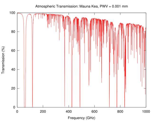 | Keywords: Atmospheric Microwave Transmittance at Mauna Kea (simulated).svg  Mauna Kea in the Gigahertz range at a precipitable water vapor level of 0 001 mm Created using http //pastebin com/raw php i uZ3mmJTY data from the http //www submm caltech edu/cso/weather/ CSO Atmospheric Transmission Interactive Plotter at the submillimeter wave astronomy site of Caltech 2012-06-05 own Westeros91 gnuplot To create this plot I used gnuplot and the http //pastebin com/raw php i uZ3mmJTY data from the http //www submm caltech edu/cso/weather/ CSO Atmospheric Transmission Interactive Plotter at the submillimeter wave astronomy site of Caltech To reproduce use the following gnuplot code <source lang gnuplot > /usr/bin/env gnuplot set terminal/output file set terminal svg enhanced size 850 680 font Helvetica 16 set output Atmospheric Microwave Transmittance at Mauna Kea simulated svg set plot title set title Atmospheric Transmission Mauna Kea PWV \ 0 001 mm remove legend unset key set title set ylabel Transmission set xlabel Frequency GHz set x/y tics set xtics 200 set ytics 20 plot data txt plot data txt using 1 3 100 with lines </source> cc-zero Uploaded with UploadWizard Plots Technical diagrams |