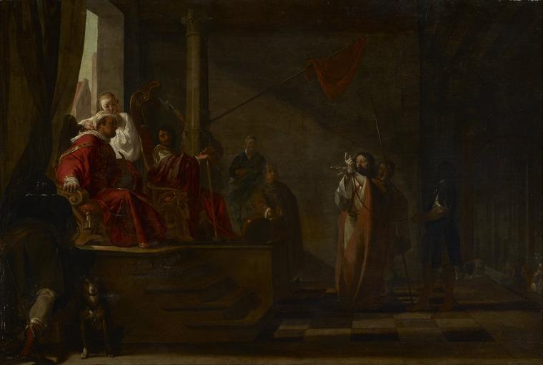 | Keywords: Attributed to Nicolaus Knüpfer - St. Paul Before the Praetor - 2012.84.4 - Minneapolis Institute of Arts.jpg User Multichill/Minneapolis Institute of Arts Q1700481 ARTSMIA Attributed to Nicolaus Knüpfer Bequest of Professor Alfred Moir standing bearded man with long hair wearing salmon-colored and white garments bound at the wrists gesturing with his hands at right accompanied by two guards--one with a long staff; two men each wearing shades of red seated on a tall platform at left; blonde woman wearing white blouse behind turbaned seated man at left; soldier seen from back leaning on platform at left accompanied by a seated dog; three other male figures at center in background; red flag on pole at diagonal extending from column at top center of image; dark interior 21 1/4 x 31 5/8 in 53 98 x 80 33 cm sight 25 3/4 x 36 in 65 41 x 91 44 cm outer frame 2012 84 4 https //api artsmia org/images/113536/5590/large jpg Q1700481 Oil on wood panel St Paul Before the Praetor https //collections artsmia org/index php page detail id 113536 Q20891798 |