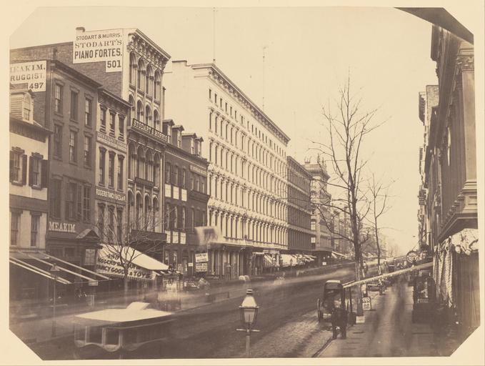| Keywords: Attributed to Silas A. Holmes (American - Broadway Looking North from Between Grand and Broome Streets - Google Art Project.jpg is not from the Getty Museum or the Google Art Project On the right of the picture is the extant E V Haughwout Building occupying the northeast corner of the intersection of Broadway and Broome Street and at left is 495 Broadway which is north of Broome Street so the camera must be at Broome Street rather than south of it Haughwout opened in 1857 LPC 11 and 42 and by late 1859 495 Broadway had been replaced by a new cast-iron building for Grover and Baker Gobright 113 SA 303 and this image with a similar view so the picture must have been taken in 1857 1858 or 1859 Also of dating interest are the signs on the side and front of 501 for Stodart Morris established in 1856 Clinkscale 360 col 1 ; the photo-related business of E Anthony had taken over 501 by May 1860 Gobright 145 The St Nicholas Hotel comprises both the white building c and the dark building just north right of it Sources plus two helpful maps are Clinkscale Martha N http //books google com/books id iqK3FPhQm5gC Makers of the Piano Vol 2 New York Oxford University Press 1999 Gobright John Christopher Pratt http //books google com/books id jBo1AQAAMAAJ The Union Sketch-book New York Pudney Russell 1860 LPC http //www nyc gov/html/lpc/downloads/pdf/reports/SoHo_HD pdf SoHo - Cast Iron Historic District Designation Report New York City Landmarks Preservation Commission August 14 1973 SA The Growth of the Sewing-machine Business Scientific American New Series Vol 1 No 19 New York November 5 1859 online at http //ebooks library cornell edu/cgi/t/text/pageviewer-idx c scia;cc scia;idno scia1001-19;node scia1001-19 3A1;view image;seq 307;size 200;page root Cornell University Library Perris William Maps of the City of New York Vol 2 Plate 30 William Perris 1852 at The New York Public Library Digital Collections http //digitalgallery nypl org/nypldigital/dgkeysearchdetail cfm trg 1 strucID 673677 imageID 1269998 parent_id 673647 snum s notword d c f k 4 sScope sLevel sLabel sort total 105 num 0 imgs 60 pNum pos 33 Image ID 1269998 Perris William Map of the City of New York 3rd ed Vol 2 Plate 22 New York Perris Browne 1857 at The New York Public Library Digital Collections http //digitalgallery nypl org/nypldigital/dgkeysearchdetail cfm trg 1 strucID 667150 imageID 1268310 total 130 num 20 parent_id 666056 s notword d c f k 1 sScope sLevel sLabel lword lfield sort imgs 20 pos 24 snum e w Image ID 1268310 1820 1886 1820 - 1886 6791139 Attributed to Silas A Holmes American American 1820 - 1886 /collection/the-j-paul-getty-museum/artwork/broadway-looking-north-from-between-grand-and-broome-streets-attributed-to-silas-a-holmes-american-1820-1886/6577761/ Attributed to Silas A Holmes American 1820 - 1886 photographer /artist/silas-a-holmes/6565886/ 6565886 /collection/the-j-paul-getty-museum/ The J Paul Getty Museum 343005 http //www getty edu/museum 3/11/2012 10 09 07 PM /collection/the-j-paul-getty-museum/artwork/broadway-looking-north-from-between-grand-and-broome-streets-attributed-to-silas-a-holmes-american-1820-1886/6577761/ 1853 about 1853 - 1855 Street Scenes St Nicholas Hotel Salted paper 292 6577761 True 1855 3/25/2012 5 16 55 AM lido getty edu-gm-obj44974 http //www getty edu/art/gettyguide/artObjectDetails artobj 44974 http //www getty edu/legal/copyright html Print 1850 1860 Not on display w391 x h292 cm about 1853 - 1855 False 1 32642487046632 Object broadway-looking-north-from-between-grand-and-broome-streets-attributed-to-silas-a-holmes-american-1820-1886 Broadway Looking North from Between Grand and Broome Streets b 391 Salted paper Street Scenes St Nicholas Hotel http //www getty edu/legal/copyright html special url_id lwH-i5Fp41JCMw PD-old-100-1923 1886 Google Art Project works by Silas A Holmes attributed Broadway in the 19th century Grand Street Manhattan Broome Street Manhattan New York City in the 1850s Photographs in the Getty Center St Nicholas Hotel 1850s photographs |