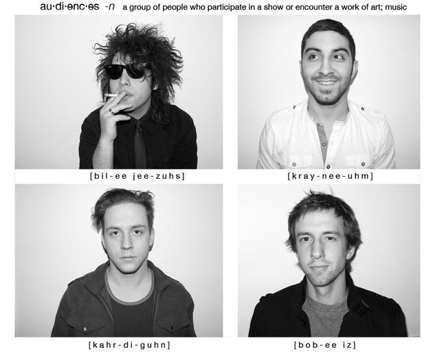 Keywords: Audiences.png en Audiences music Chicago own Audiences 2011-02-20 Cc-zero Musical groups from the United States Four people Musical quartets Black and white photographs Portrait photographs Men looking at viewer