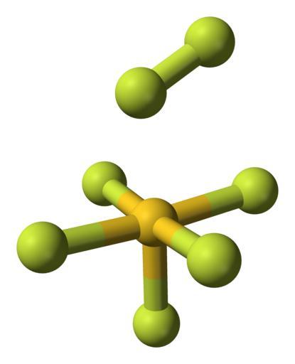 | Keywords: AuF5-F2-calculated-B3LYP-2007-3D-balls.png  Ball-and-stick model of the gold heptafluoride 'molecule' AuF<sub>7</sub> It is better thought of as a weak association of gold pentafluoride and difluorine i e AuF<sub>5</sub>·F<sub>2</sub> Colour code FFD124 Gold Au golden yellow D4F03F Fluorine F yellow-green Structure calculated using DFT reported in http //dx doi org/10 1021/ic700431s Inorg Chem 2007 46 5338 “5342 Image generated in http //accelrys com/products/discovery-studio/visualization/discovery-studio-visualizer html Accelrys DS Visualizer Own 2012-12-23 Ben Mills Benjah-bmm27 Images by Ben Mills Ball-and-stick models Gold heptafluoride |